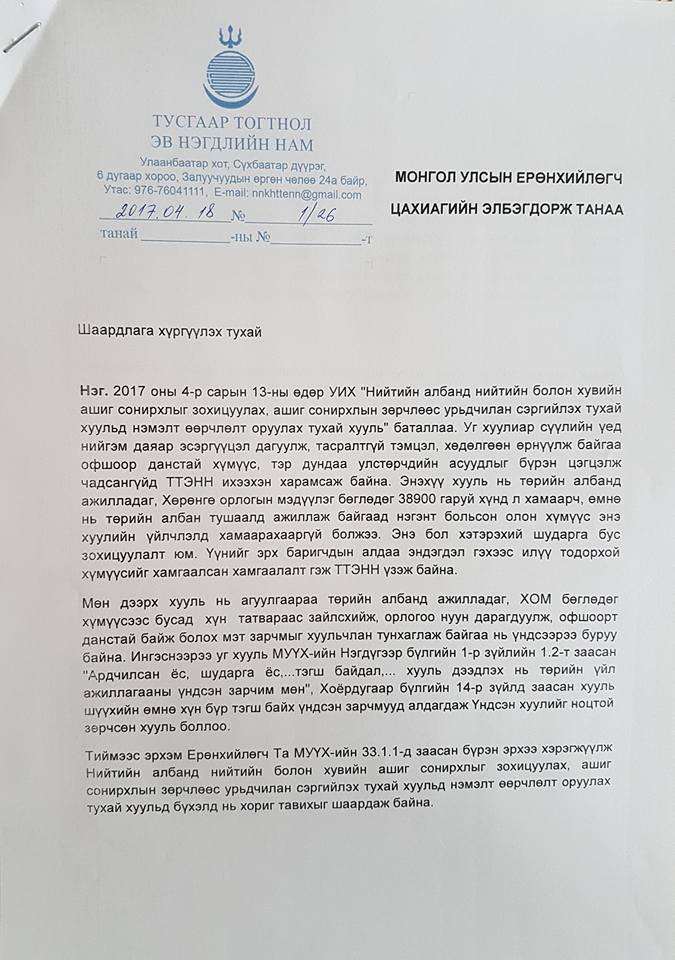 Тусгаар тогтнол эв нэгдлийн намаас Нийтийн албанд нийтийн болон хувийн ашиг сонирхлыг зохицуулах, ашиг сонирхлын зөрчлөөс урьдчилан сэргийлэх тухай хуулийг шинээр баталсантай холбоотойгоор Монгол Улсын Ерөнхийлөгчид ханджээ. Тус хуульд офшоортнуудыг хамгаалсан хууль болсон гэж үзэн хориг тавих шаардлага хүргүүлжээ. Мөн элчин сайд С.Баярын асуудлаар байр сууриа тодорхой илэрхийлэхийг шаардсан байна.