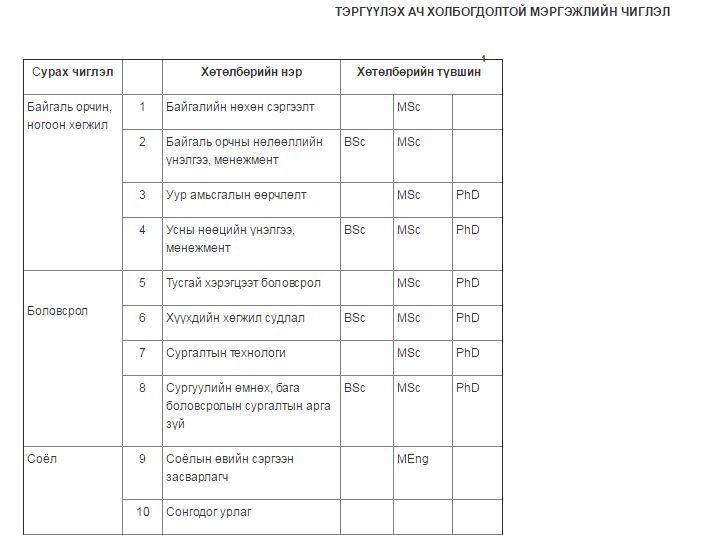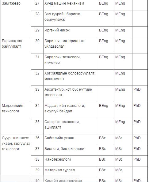 - 2014 оны засгийн газрын 71-р тогтоолоор тэргүүлэх ач холбогдолтой мэргэжлийн жагсаалтыг гаргасан. Энэ тогтоолд багтсан мэргэжлүүд тэрүүлэх ач холбогдолтой хэвээрээ байгаа. Эдгээр мэргэжлээр төгссөн тохиолдолд ажлын байр олдох өндөр магадлалтай. Гэхдээ ажлын байртай болох нь хувь хүнээс шалтгаална.