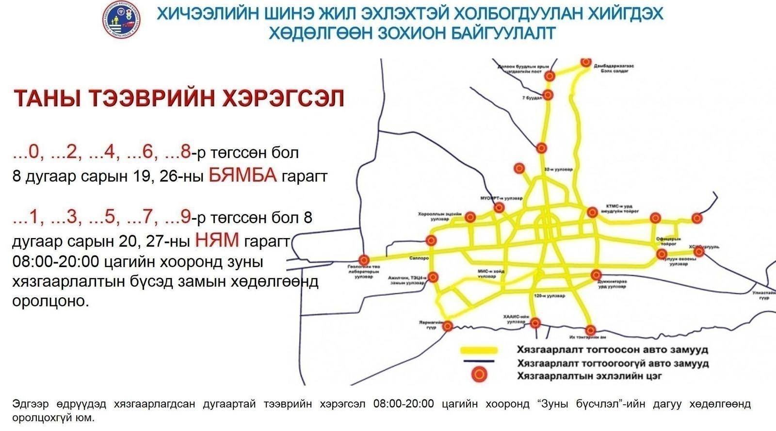 Хичээлийн шинэ жил эхлэх гэж байгаатай холбогдуулан амралтын өдрүүдэд автомашиныг улсын дугаарын тэгш, сондгойгоор ангилж, замын хөдөлгөөнд оролцуулахаар болсон.