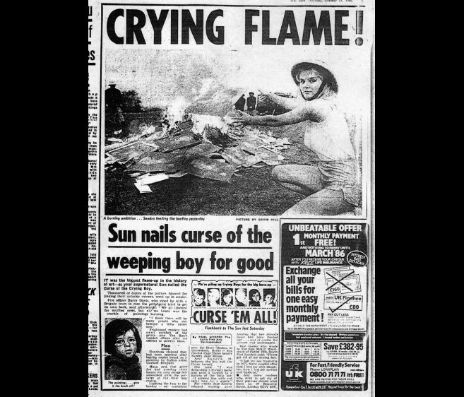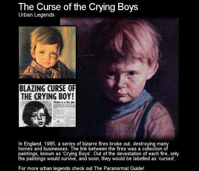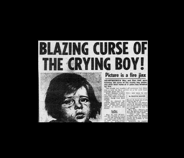 - Сандра Крекс энэ зургийг худалдаж аваад цөөн хонож байтал хадам эгч, найз хоёртойгоо галд өртөж сүйрэх дөхжээ. Энэ үед галан дунд уйлж буй хөвгүүний зураг огт шаталгүй ганхаж байхыг ажжээ.