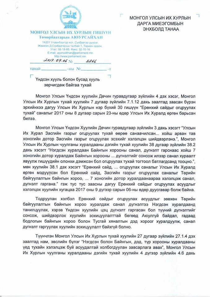 Албан тоотдоо “Ерөнхий сайдыг огцруулах асуудлыг хэлэлцэж шийдвэрлэх хуулийн хугацаа 2017 оны есдүгээр сарын 06-ны өдрөөр дуусгавар болж байхад УИХ-ын нэр бүхий 30 гишүүний өргөн барьсан саналд огт дурьдагдаагүй буюу “Шадар сайдыг тагнаж чагнасан” асуудлыг Бүлгийн нэгдсэн шийдвэрээр бус Бүлгийн саналын дагуу Аюулгүй байдлын байнгын хороо болон Тусгай хяналтын дэд хороогоор хэлэлцүүлэхээр завсарлага өгсөн Таны үйлдэл нь Монгол Улсын Их хурлын чуулганы Дэгийн тухай хуулийн 4 дүгээр зүйлийн 4.6, 38 дугаар зүйлийн 38.2 дахь хэсэг, Монгол Улсын Их хурлын тухай хуулийн 16 дугаар зүйлийн 16.5, 27 дугаар зүйлийн 27.4 дэх заалтыг шууд зөрчсөн үйлдэл боллоо” гэжээ.