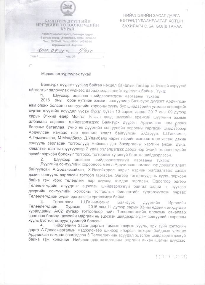 Хотын даргаас 2017 оны 9 дүгээр сарын 05-ны өдрийн 01/3049 тоот албан бичгээр дүүргийн ИТХ-д ирүүлсэн албан бичигт нэр бүхий төлөөлөгчдийг хууль зөрчсөн гэж үзсэн тухайгаа мэдэгджээ. Гэтэл Монгол Улсын дээд шүүхээс дээрх нэр бүхий төлөөлөгчид хууль зөрчөөгүй болохыг тогтоосон шүүхийн шийдвэр гараад багагүй хугацаа өнгөрчээ. Иймд хотын даргаас Монгол Улсын Үндсэн хуулийн 47 дугаар зүйлийн 47.1, 59 дүгээр зүйлийн 59.2 дах хэсэг, Засаг захиргаа нутаг дэвсгэрийн нэгж, түүний удирдлагын тухай хуулийн 18 дугаар зүйлийн 18.1, 18.1.1а дах хэсгүүдийг ноцтой зөрчин нутгийн өөрөө удирдах байгууллагын эрхэнд удаа дараа халдахгүй байхыг дүүргийн ИТХ-аас хүссэн байна.