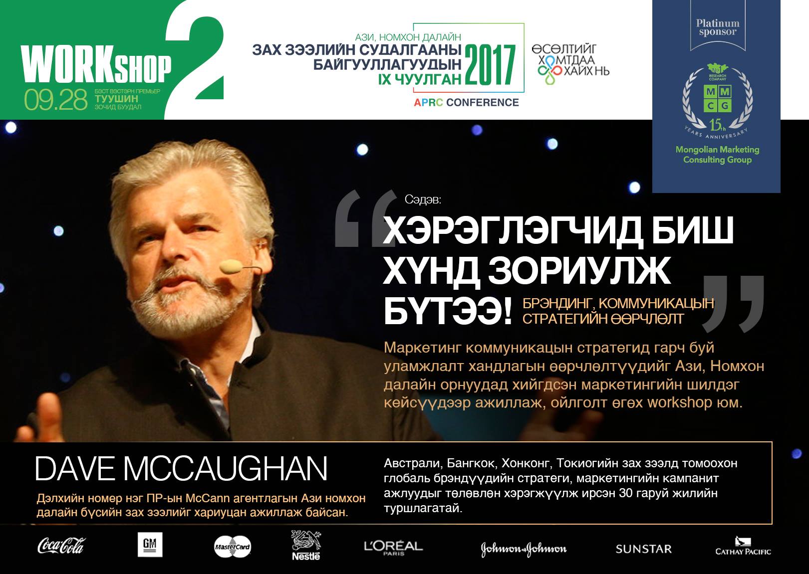 Workshop-2:Дэлхийн номер нэг PR-ийн McCanагентлагын Ази, Номхон далайн бүсийн зах зээлийг хариуцан ажиллаж байсан DAVE MCCAUGHAN “ХЭРЭГЛЭГЧИД БИШ ХҮНД ЗОРИУЛЖ БҮТЭЭ, БРЭНДИНГ КОММУНИКАЦЫН СТРАТЕГИЙН ӨӨРЧЛӨЛТ” сэдвийн хүрээнд зохион байгуулах бөгөөд Маркетинг коммуникацын стратегид гарч буй өөрчлөлтүүдийг Ази, Номхон далайн орнуудад хийгдсэн маркетингийн шилдэг кейсүүдээр ажиллаж, ойлголт өгөх workshopюм.