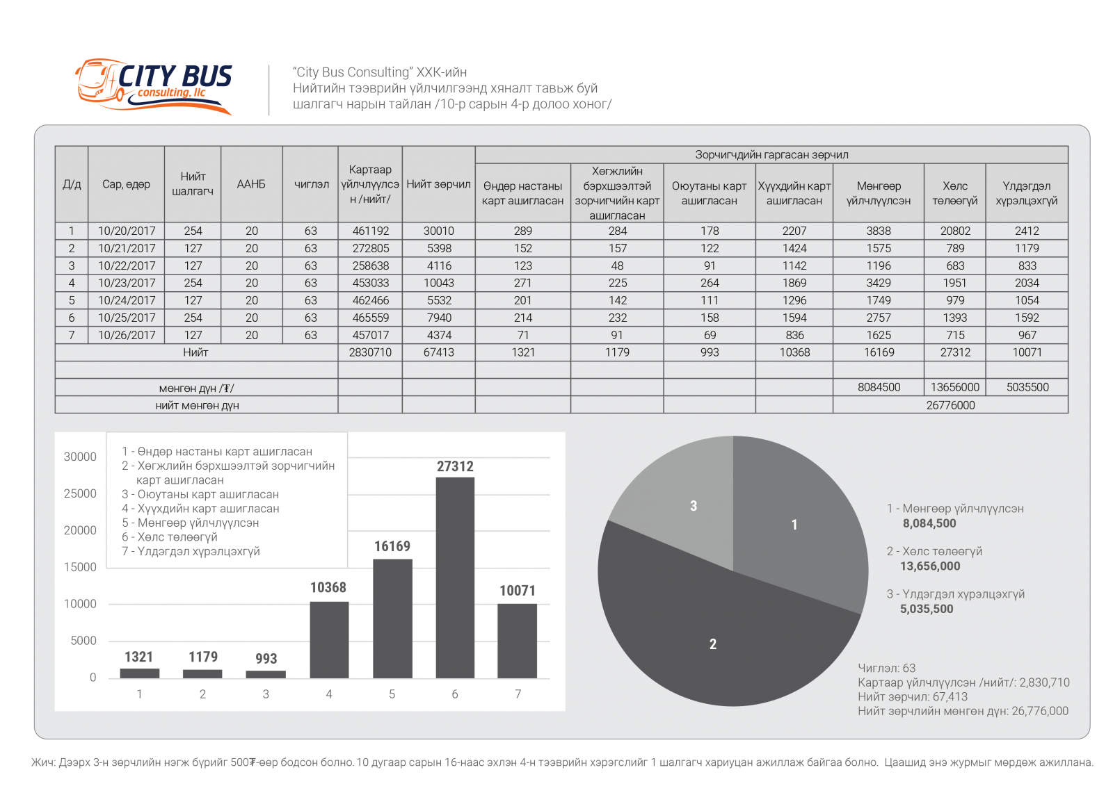 Уг шалгалтаар нийт 67413 зорчигчоос зөрчил илэрсэн байна. Өндөр настны карт ашигласан 1321, Хөгжлийн бэрхшээлтэй зорчигчийн карт ашигласан 1179, Оюутаны карт ашигласан 993, Хүүхдийн карт ашигласан 10,368, Мөнгөөр үйлчлүүлсэн 16169, хөлс төлөөгүй 27312, үлдэгдэл хүрэлцэхгүй 10071 тооны гэх мэт нийт 67413 зөрчил илэрсэн байна.