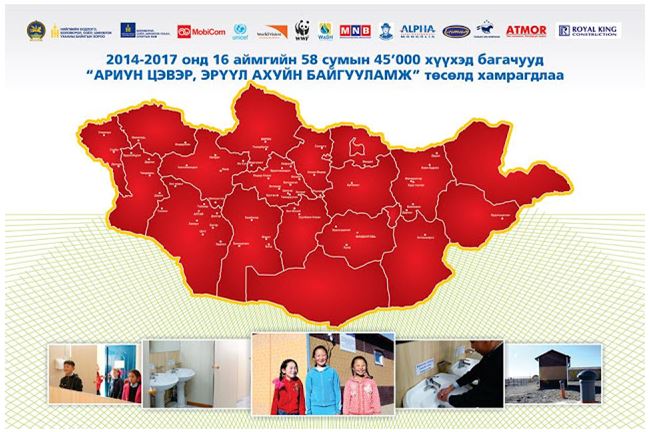 · “Дэлхийн зөн” ОУБ, Мобиком корпорациуд нь “Ариун цэвэр эрүүл ахуйн байгууламж” төслийг санаачилан, 4 жилийн дотор 16 аймгийн 58 сумын сургууль, цэцэрлэгийн 45,000 орчим хүүхэд багачуудыг жилийн дөрвөн улиралд халуун, хүйтэн усаар гар угааж, боловсон бие засах орчныг бүрдүүлж чаджээ.