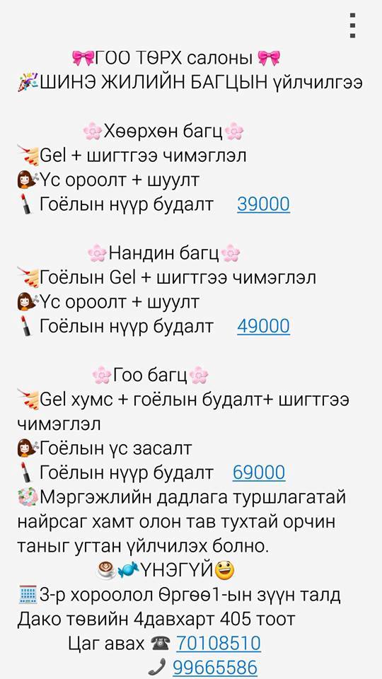 Гоо сайхныг эрэлхийлсэн эрхэм бүсгүй та “Гоо төрх” салоныг зорин очиж дараах үйлчилгээг авах боломжтой.
