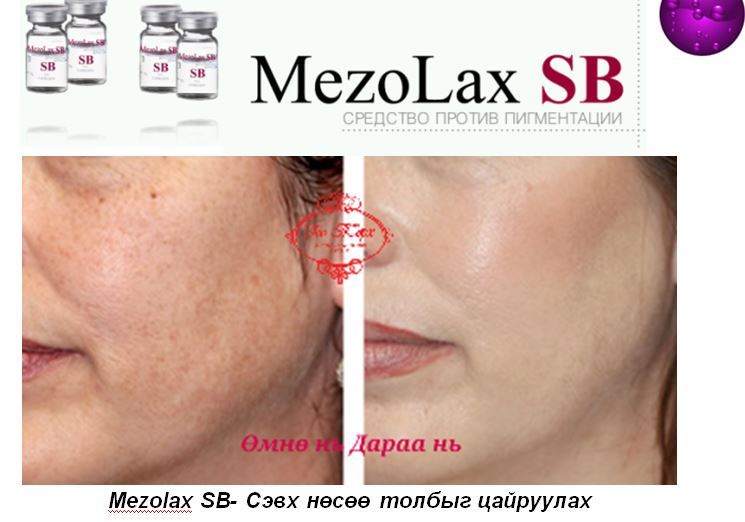 Mezolax SB нь нөсөөнөөс урьдчилан сэргийлэх, багасгах болон насны нөлөөний толботой тэмцэхэд зориулагдсан аж. Зургаан төрлийн идэвхжүүлсэн найрлагатай, өндөр үйлчилгээтэй цайруулах цогц юм. Найрлагадаа эсийг өсгөх цитокин ба био синтетик хүчин, амин дэмүүд, үл исэлдүүлэгч ба ургатал ханд агуулжээ. Ямарч насны ангиллын арьсыг цайруулж цагааруулдаг байна.