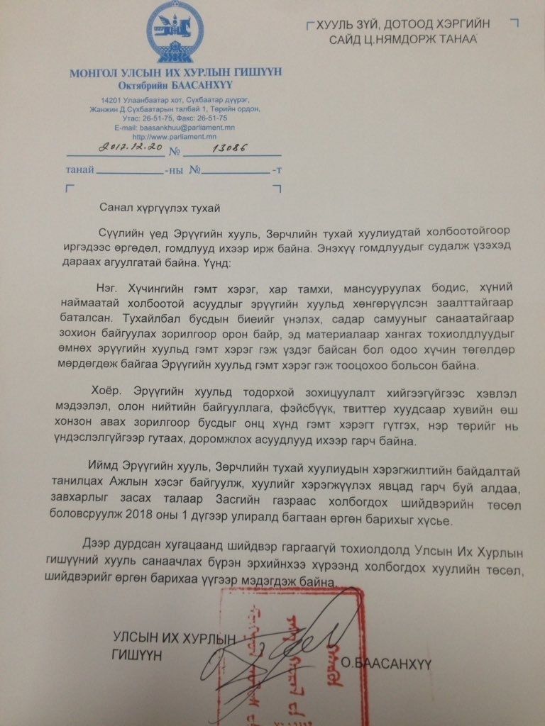 УИХ-ын гишүүн О.Баасанхүү Хууль Дотоод Хэргийн сайд Ц.Нямдоржид албан шаардлага хүргүүллээ.