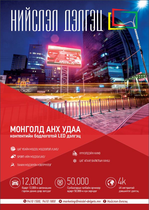 - Улаанбаатар хотын хэмжээнд хамгийн анхны контентүүдийг нэвтрүүлэгч дэлгэц. Маамуу хүүхлэлдэйн кино 18:20 цагт, Монгол ТВ-н Оргил цаг мэдээллийн хөтөлбөр 20:00 цагт, Бямба, Ням гарагт NBA сагсан бөмбөгийн шилдэг тоглолтуудын 3,4-р үеийг шууд дамжуулж байна. Мөн цаг агаарын мэдээ тогтмол нэвтрүүлж байна.