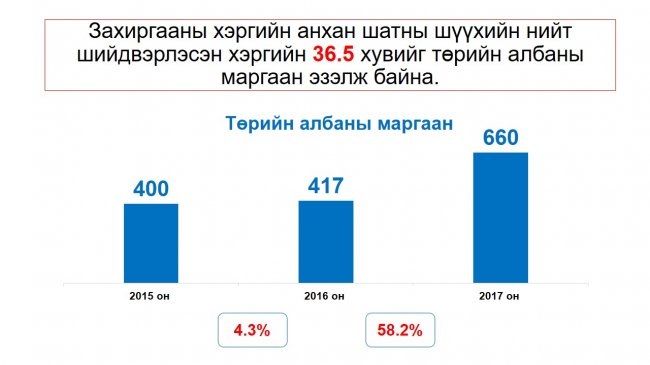 Шүүхийн Ерөнхий зөвлөлөөс өгч буй тайлан мэдээгээр 2017 онд захиргааны хэрэг 7.2 хувиар өсчээ. Үүнээс Захиргааны хэргийн анхан шатны шүүхээс шийдвэрлэсэн нийт хэргийн 36.5 хувийг төрийн албаны маргаан эзэлж байна. Энэ нь өмнөх онуудаас 58.2 хувиар өссөн үзүүлэлт юм. Ийнхүү өсөх болсон шалтгааныг Сонгууль болсонтой холбоотойгоор ажлын байрны халаа сэлгээний асуудал нөлөөлсөн гэж үзэж байна.