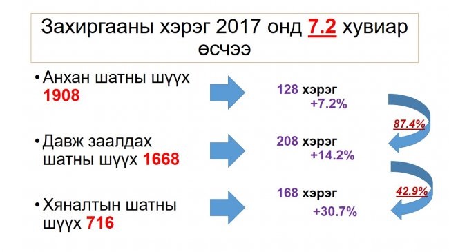 Захиргааны хэргийн хувьд төрийн албаны маргаан 58.2 хувиар, үл хөдлөх эд хөрөнгийн улсын бүртгэлтэй холбоотой маргаан 34.9 хувиар, ашиг малтмалтай холбоотой маргаан 21.1 хувиар тус тус өсчээ.