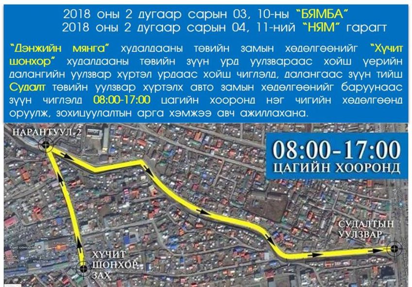 2. Чингэлтэй дүүргийн нутаг дэвсгэрт 2018 оны 2 дугаар сарын 03, 04, 10, 11-ний амралтын өдрүүдээр “Дэнжийн мянга” худалдааны төвийн замын хөдөлгөөнийг “Хүчит шонхор” худалдааны төвийн зүүн урд уулзвараас хойш үерийн далангийн уулзвар хүртэл урдаас хойш чиглэлд, далангаас зүүн тийш Судалт төвийн уулзвар хүртэлх авто замын хөдөлгөөнийг баруунаас зүүн чиглэлд 08:00-17:00 цагийн хооронд нэг чигийн хөдөлгөөнд оруулж, зохицуулалтын арга хэмжээ авч ажиллахаар боллоо.