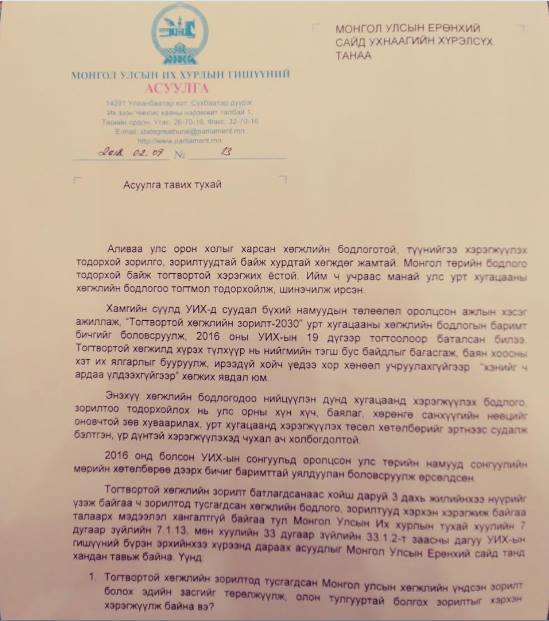 Тогтвортой хөгжлийн зорилт батлагдсанаас хойш даруй 3 дахь жилийнхээ нүүрийг үзэж байгаа ч зорилтод тусгагдсан хөгжлийн бодлого, зорилтууд хэрхэн хэрэгжиж байгаа талаарх мэдээлэл хангалтгүй байгаа тул гишүүд ийнхүү УИХ-ын гишүүний бүрэн эрхийнхээ хүрээнд асуулга тавьжээ.