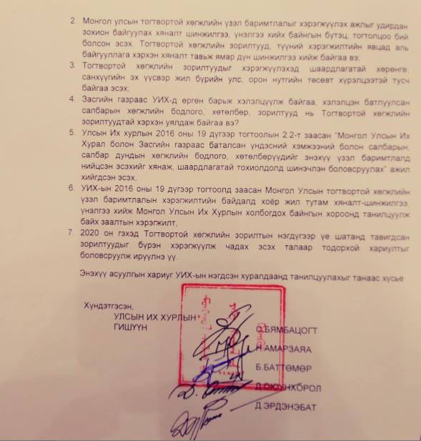 Мөн 2016 онд болсон УИХ-ын сонгуульд оролцсон улс төрийн намууд сонгуулийн мөрийн хөтөлбөрөө дээрх бичиг баримттай уялдуулан боловсруулж өрсөлдөж байсан юм.