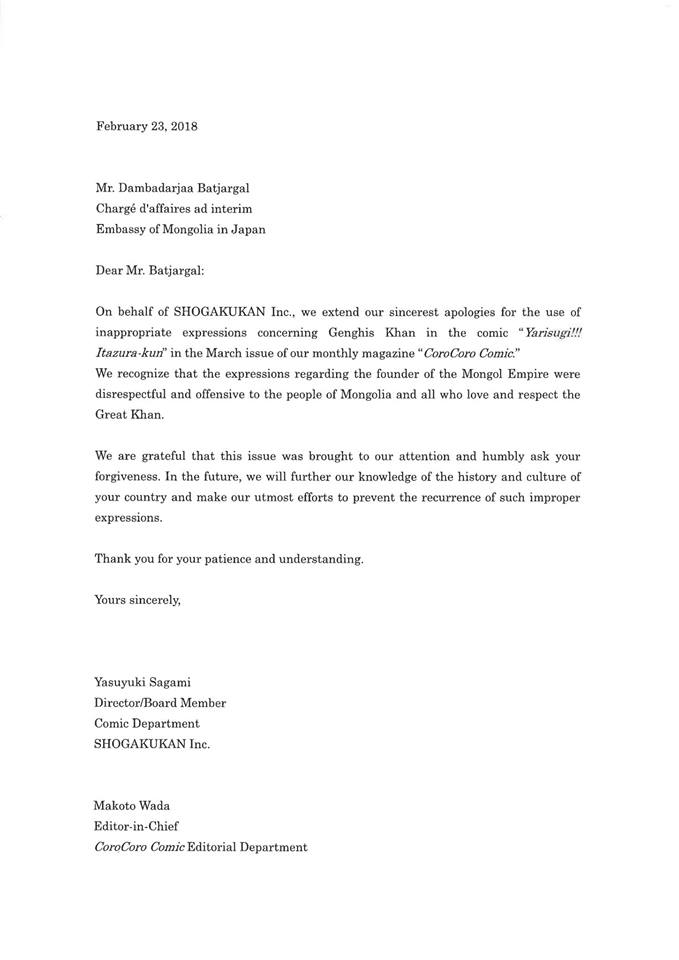 Мэдэгдэлд “Корокоро сар тутмын сэтгүүл дээр Монголын түүх соёлыг төдийгүй Японы төр засаг, ард түмний Монгол улстай найрсаг харилцаагаа өргөжүүлэн хөгжүүлэх гэсэн чин эрмэлзлийг үл хүндэтгэсэн агуулга бүхий ёс суртахуунгүй зураг гарчээ. Энэ нь дан ганц ёс суртахууны хэм хэмжээг зөрчөөд зогсохгүй садар самууны сурталчилгааг хориглосон, хүүхдийн эрхийг хамгаалахаар чиглэсэн Японы хууль тогтоомжийг зөрчиж байна гэж үзэж байна. Иймд энэхүү ёс суртахуунгүй үйлдэлд гүнээ харамсаж Японы Гадаад хэргийн яаманд эсэргүүцлээ илэрхийлэхийн ялдамд Японы тал уг асуудалд хуулийн хүрээнд зохих анхаарал хандуулна гэж итгэж байна. Монгол Улсаас Япон Улсад суугаа Элчин сайдын яамны хэргийг түр хамаарагч Д. Батжаргал" гэсэн юм.