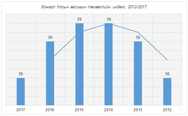 Монгол Улсын авлигын төсөөллийн индекс 2017 онд 36 оноотой болж, өмнөх оны үзүүлэлтээс 13 байраар ухарчээ. “Трансперенси интернэшнл” олон улсын байгууллагаас авлигын асуудлаарх нэр хүнд бүхий судалгаа, үнэлгээний 13 байгууллагын тайлан болон энэ чиглэлийн шинжээч, бизнесийн удирдах албан тушаалтнуудын үнэлгээнд тулгуурлан дээрх үнэлгээг гаргажээ.