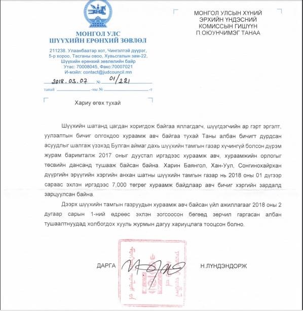 Уг асуудал нь хуульд нийцсэн дүрэм, журамгүй зохицуулалтгүйгээр явагдаж байх тул нэн яаралтай таслан зогсоож, дотоодын хяналт шалгалт зохион байгуулж, илэрсэн зарчил, дутагдлыг арилгаж, холбогдох албан тушаалтанд хариуцлага тооцож хуулийн дагуу ажиллах Шаардлагыг Хүний эрхийн Үндэсний Комиссын гишүүн П.Оюунчимэгээс Шүүхийн ерөнхий зөвлөлийн дарга Н.Лүндэндоржид 2017 оны 01 дүгээр сарын 16-нд явуулжээ. Тус Шаардлагыг ШЕЗ хүлээн авч, зөрчлийг арилгуулан, иргэдээс хураамж авдаг байдлыг хоёрдугаар сарын 01-ний өдрөөс эхлэн зогсоон, холбогдох арга хэмжээг авсан байна.