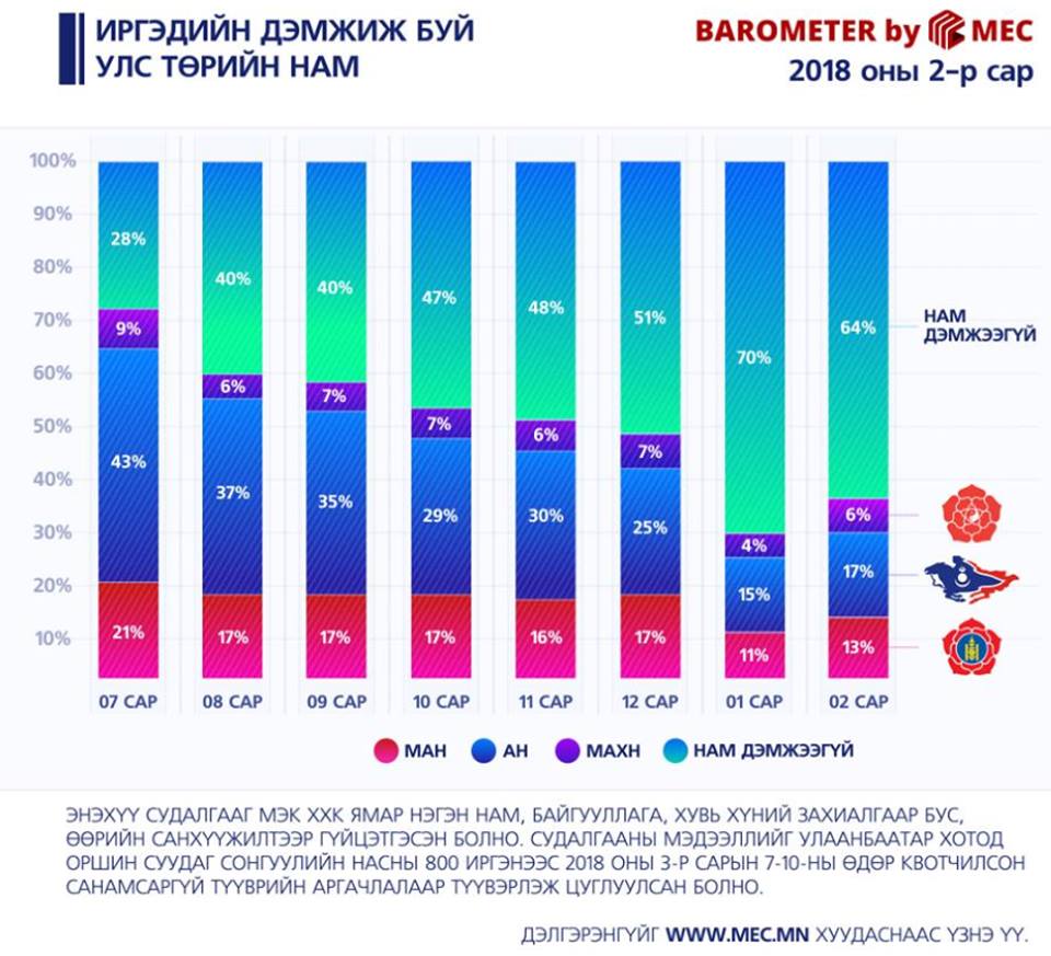 17 хувь нь МАН, 13 хувь нь АН, 6 хувь нь МАХН гэж нэрлэжээ. Судалгаанаас харахад, МАН, АН хоёр нийлээд 30 хувийн санал авсан нь иргэдийн улстөрийн намд итгэх итгэл буурсныг харуулж байгаа юм.