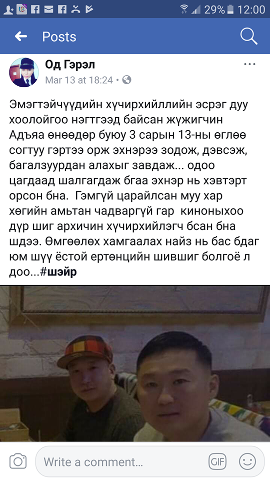- Цагдаагийн байгууллагаас Адъяаг эрэн сурвалжилж байгаа. Адъяа гэр орондоо болон ээж дээрээ очихгүй байгаа гэсэн. Утас нь холбогдохгүй байгаа юм. Цагдаа нар хаана байгааг нь мэдэхгүй байна. Сүүлийн үед олон баяр давхацсанаас болоод цагдаагийн байгууллагынхан хангалттай сайн эрэн сурвалжилж чадаагүй байх. Найз маань зодуулаад, хажуу айлынхаа хаалгыг нүдээд тусламж гуйж, цагдаа дуудаж өгөхийг хүссэн. Тэр хооронд Адъяа нүцгэн шахуу гэрээсээ гараад зугтаасан гэсэн. Миний пост дор хамгийн сүүлд Адъяаг цэргийн баяраар “Mint club”-д байхыг харсан гэж нэг хүн бичиж байна лээ.