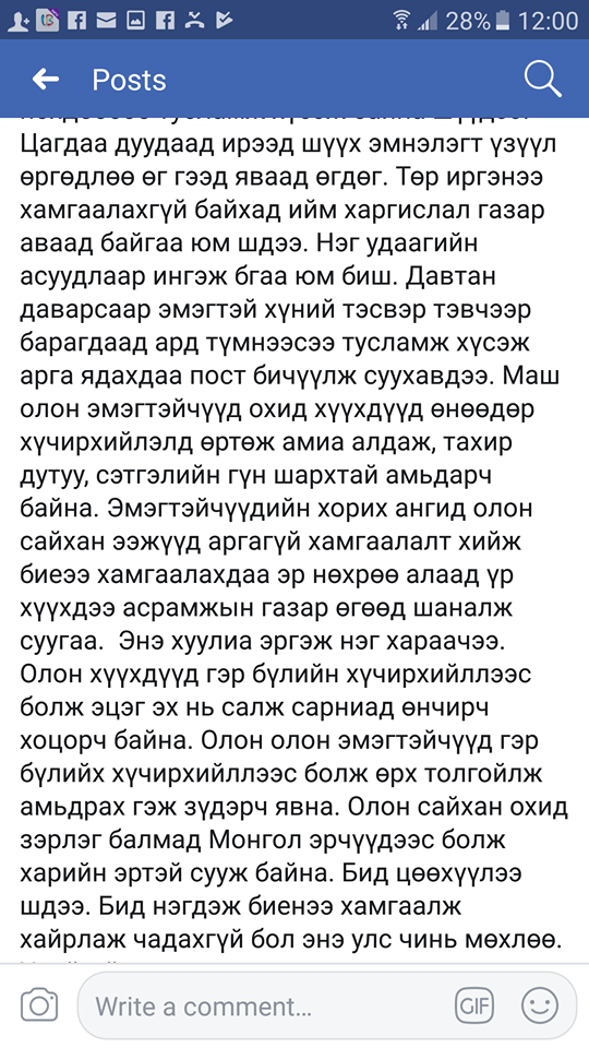 Хэн нэгэн залууд уурласан уураа Муусайн Монгол эрчүүд гэж ирээдл муулж доошоо хийхийн.Ийм байхад гадаад хүнтэй суухгүй яадгийнч гэх шиг.Тэр муу монгол эрчүүд чинь хүүхнүүд та нарын хатан ухаанаар өсгөн хүмүүжүүлсэн хөвгүүд чинь том болоод ийм байдалтай байгаа.Тэрний оронд охид хөвгүүдээ багаас нь ингэж хүмүүжүүлж үүнд нь анхааръя гээдл санаагаа хэлээчдээ.Тэр муусайн эрчүүлд та нарын уул шиг сайхан эцэг чинь, хангай шиг сайхан түшигтэй ах чинь, хөлийг чинь хучиж гар дээрээ өргөөд явах хүү чинь багтаж байгаа.битгий эрчүүдийг даяар нь доошоо хий дээ