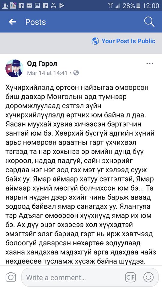 Яг өөрсдөө иймэрхүү хүчирхийлэл хийдэг адгууснууд л ийм адьяаг өмөөрсөн пост бичиж байгаа нь ойлгомжтой Ийм оюуны тураалд орж ялзарсан юмнууд олширчээ Нийгэмд л буруугаа өгөх байх ямар ч буруу юм хийсэн байсан эмэгтэй хүнд гар хүрдэг эрчүүд сонин л байнаЯалтай ч билээ