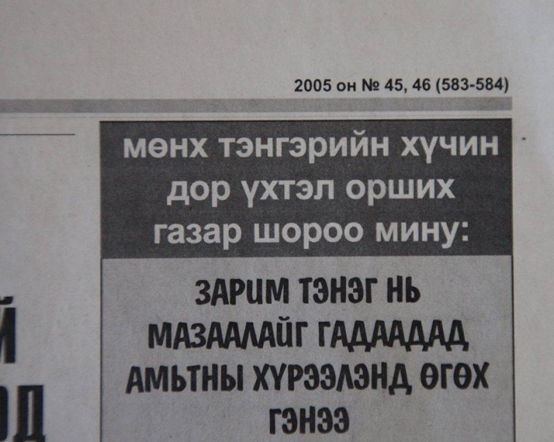-Хэ цэс... Улаанбаатар тэр чигээрээ хужаа хороолол болчихсон шүү дээ. Одоо Монгол Улс Хятадын муж болох л үлдлээ. Үүнийг хужаа нартай гүн холбоотой УИХ-ын гишүүд нь гүйцэлдүүлнэ биз. Би нэг зүйлд маш их эмзэглэж байна. МАХН-д цагаан морин жилийн хувьсгалаас хойш “Хятадын эрлийз, хурлийз” нар буюу хужаа цустангууд маш олноор шургалан орох болсон. Сүүл үеэс МАХН-д хужаа цустангууд ноёлох боллоо. Уул нь Коммунист нам гэж зүхээд байгаа МАХН чинь их цэвэр цустай Монгол хүмүүсээс бүрдсэн гишүүдтэй, улс төрийн зөв бодлого барьдаг “үндэсний том нам” байсан юм шүү дээ. Одоо энэ “Монгол Ардын Хувьсгалт Нам”-д шурган орсон хужаа цустангууд “Ардчилсан Нам”-д байгаа хужаа цустангуудтайгаа эвсээд, нэг нэгнээ ил далд дэмжээд Монгол Улсыг хувааж мөлжин идэж эхэллээ. МАХН болон Ардчилсан Намын хоорондын зөвшилцөл гэгч зүйлийн цаана юу болоод байгааг уг нь Монголын ард түмэн харж, мэдэж байгаа. Ард түмэн бол тэнэг биш шүү. Тэд Монгол Төрийн толгойд гарсан хүмүүсийн гутамшигт үйлдлүүд засрах байх гэж л харзнан хүлээж байгаа. Тэгээд болохгүй бол тэвчээр алдарсан ард түмэн босно. Тэр мөчид үндэсний алуурчин ч Төр тэргүүлэхийг үгүйсгэхгүй. Өнөөдөр Монгол Төрийг, Монгол Улсыг ямар ямар хүмүүс, ямар ямар хүмүүсийн, ямар ямар улсын далд бодлогоор ингэж сүйрүүлж байна вэ гэдгийг би нэр устай нь, үйлдэж буй хэрэгтэй нь, учир шалтгаантай нь хэлж өгч чадна. Даанч та нар сонин хэвлэлдээ нийтэлж чадахгүй л дээ. Өнөөдөр “Монгол Улсын үндэсний аюулгүй байдал” сүйрч буйн нэг тод илрэл бол чиний хэлдэг Монгол газар нутагт энд тэндгүй харь хэлээр бичсэн хаяг, рекламууд олширч буй явдал.
