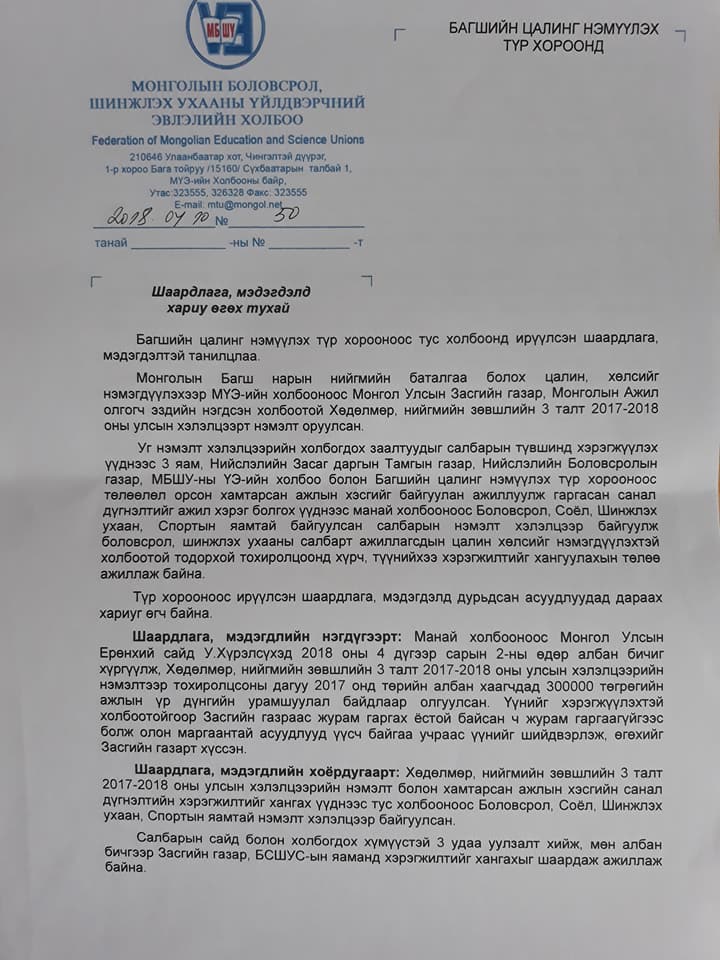Гуравдугаарт, Боловсролын салбарын чанарыг сайжруулахад төрөөс анхаарч, 2020 он гэхэд багшийн цалинг олон улсын жишгээр 3500 ам.доллартай дүйцэх хэмжээнд хүргэх тухай дурдсан шаардлага тавьсан хэдий ч асуудал шийдэгдээгүй нам жим өнгөрсөн юм. Харин энэ оны дөрөвдүгээр сарын 10-ны өдөр МБШУҮЭ-ээс шаардлагын хариуг илгээсэн бөгөөд тус хариундаа "Шаардлага мэдэгдлийн нэгдүгээрт: Манай холбооноос Монгол Улсын Ерөнхий сайд У.Хүрэлсүхэд 2018 оны 4 дүгээр сарын 2-ны өдөр албан бичиг хүргүүлж, Хөдөлмөр, нийгмийн зөвшлийн 3 талт 2017-2018 оны улсын хэлэлцээрийн нэмэлтээр тохиролцсоны дагуу 2017 онд төрийн албан хаагчдад 300.000 төгрөгийн ажлын үр дүнгийн урамшуулал байдлаар олгуулсан. Үүнийг хэрэгжүүлэхтэй холбоотойгоор Засгийн газраас журам гаргах ёстой байсан ч журам гаргаагүйгээс болж олон маргаантай асуудлууд үүсч байгаа учраас үүнийг шийдвэрлэж өгөхийг Засгийн газарт хүссэн " гэсэн аж. Иймд тэмцлийн эцсийн шат бүхий хугацаагүй ажил хаялт зарлахаа "Багшийн цалин нэмэгдүүлэх түр хороо"-оос албан ёсоор мэдэгдээд байгаа юм.