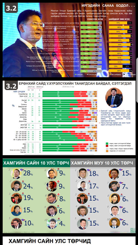 Эдийн засгийг сэргээх, төрийн хариуцлагатай зөв тогтолцоог бий болгох үндсэн зорилгын дор байгуулагдсан У.Хүрэлсүхийн Засгийн газрын үйл ажиллагаа болон хувь улстөрчдийн рейтэнгийг судалгааны дөрвөн байгууллагаас тогтоон нийтэд зарласнаас харахад өнөөдрийн Засгийн газар богино хугацаанд чамгүй ажиллаж байгааг харуулсан бөгөөд шударга ёсыг эрхэмлэж буй гишүүдийг илтэд дэмжсэн дүгнэлт гарчээ.