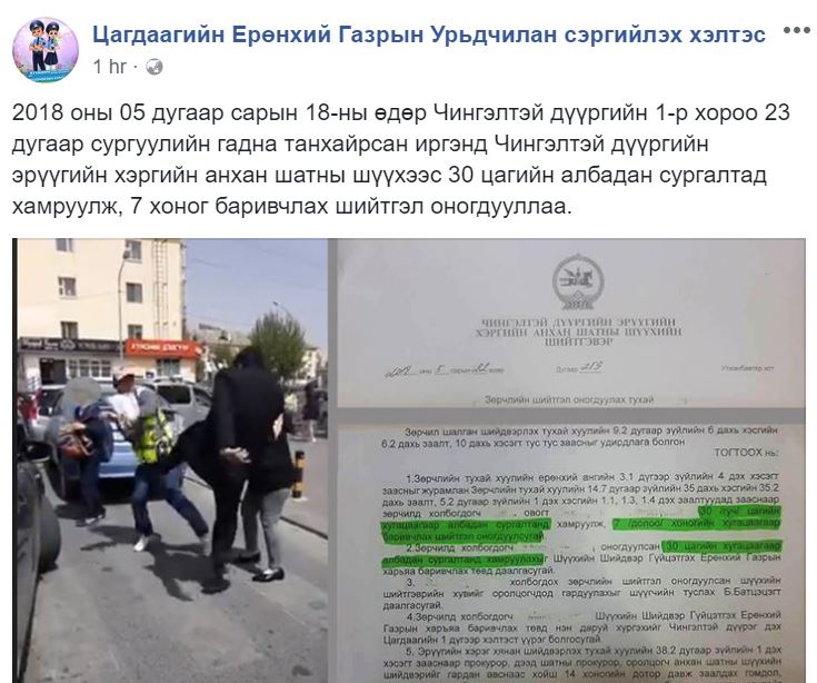 Ингээд 2018 оны 05 дугаар сарын 18-ны өдөр Чингэлтэй дүүргийн 1-р хороо, 23 дугаар сургуулийн гадна зам дээр танхайрсан иргэнд Чингэлтэй дүүргийн эрүүгийн хэргийн анхан шатны шүүхээс 30 цагийн албадан сургалтад хамруулж, 7 хоног баривчлах шийтгэл оногдуулжээ.