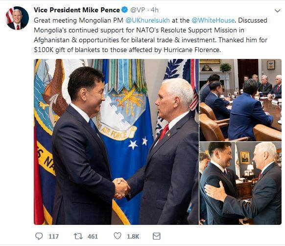 Монгол Улсын Ерөнхий сайд Ухнаагийн Хүрэлсүх Цагаан Ордны урилгаар 2018 оны 9 дүгээр сарын 18-наас Америкийн Нэгдсэн Улсад албан ёсны айлчлал эхлүүлээд байна. Ерөнхий сайд айлчлалынхаа эхэнд өчигдөр АНУ-ын дэд Ерөнхийлөгч Майк Пэнстэй Цагаан ордонд уулзаж, хоёр орны харилцаа, хамтын ажиллагааг өргөжүүлэх талаар санал солилцлоо.