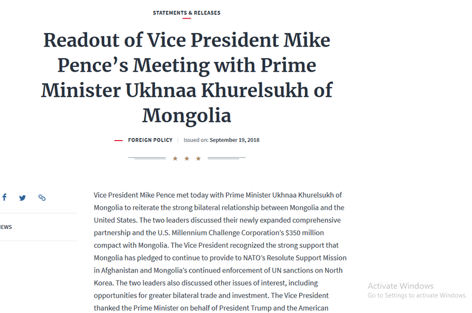 Уулзалтын талаар Цагаан ордны албан ёсны цахим хуудаст "АНУ-ын дэд Ерөнхийлөгч Майк Пэнс Монгол Улсын Ерөнхий сайд У.Хүрэлсүхтэй хоёр улсын харилцан ашигтай харилцаа, хамтын ажиллагааг хөгжүүлэх талаар санал солилцлоо. Хоёр улсын хамтын ажиллагааны хүрээнд АНУ-ын "МСК" 350 сая ам.долларын буцалтгүй тусламж олгохоор болж байгаа юм. АНУ-ын зүгээс НАТО-гаас Афганистанд явуулж байгаа ажиллагаанд цаашид үргэлжлүүлэн дэмжихийг хүсэв. Мөн хоёр талын худалдаа, хөрөнгө оруулалтын боломжуудыг хэлэлцэв. Монгол Улс "Флоренс" хар шуурганд өртсөн АНУ-ын иргэдэд 100 мянган ам.доллартай тэнцэх хэмжээний тэмээний ноолууран хөнжил бэлэглэв" хэмээн мэдээлжээ.