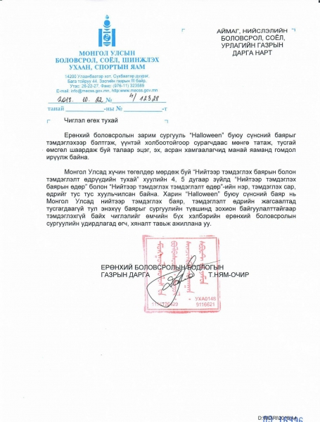 Ерөнхий боловсролын зарим сургуулиуд “Halloween” буюу сүнсний баярыг тэмдэглэхээр бэлтгэж, сурагчдаас мөнгө татаж, тусгай өмсгөл шаардаж байгаа тухай эцэг, эхчүүдийн гомдол Боловсрол, соёл, шинжлэх ухааны яаманд ирэх болжээ.