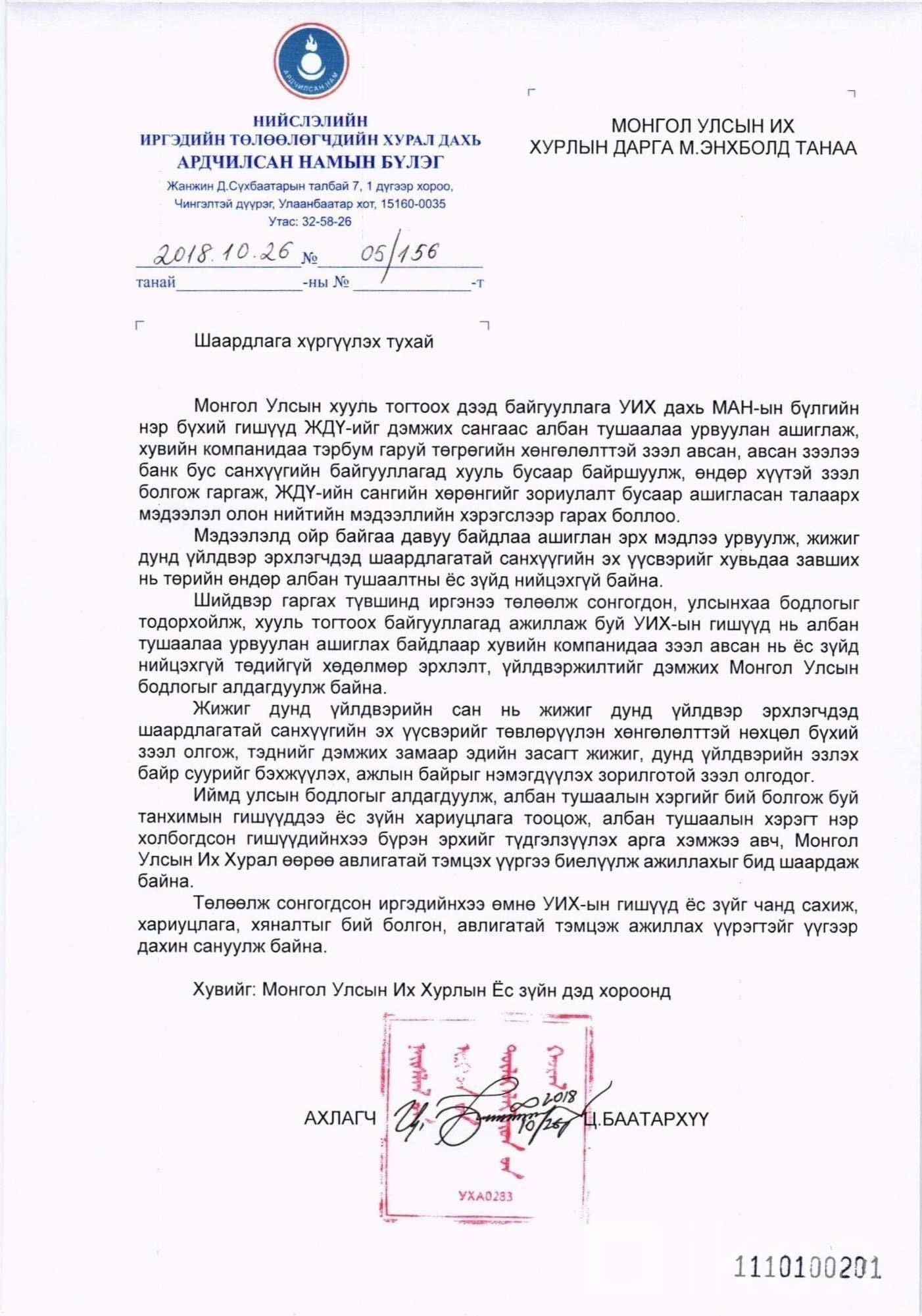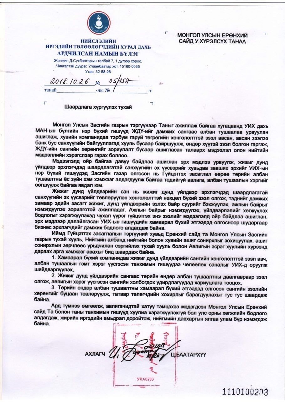 МОНГОЛ улсын ТѲР-д Шаардлага хүргүүлэх тухай. 2017 оны улсын тѳсѳв батлах үед 2018 оны ЖДҮДС-н хѳнгѳлѳлттэй зээлийн тѳсвийн санхүүжилтыг 70,0 тэрбум тѳгрѳгѳѳр уухайлан батлуулж, угтаа бол жижиг дүнд үйлвэрлэл эрхлэнчидээ дэмжинээ хэмээн 2018 онд шууд болон шууд бусаар ѳѳсдѳѳ авчихсан асуудалыг нягтлан шалгаж, шударга бус тѳсвийн зарцуулалтыг зѳв гольдролд нь оруулж ѳгѳхийг шаардаж байна. Жич: Цаашид энэ мэт зохисгүй үйлдлийг огт гаргуулахгүй байх талаас нь анхаарч ажиллахыг хүсэж байна. хувийг нийт ард түмэнд.