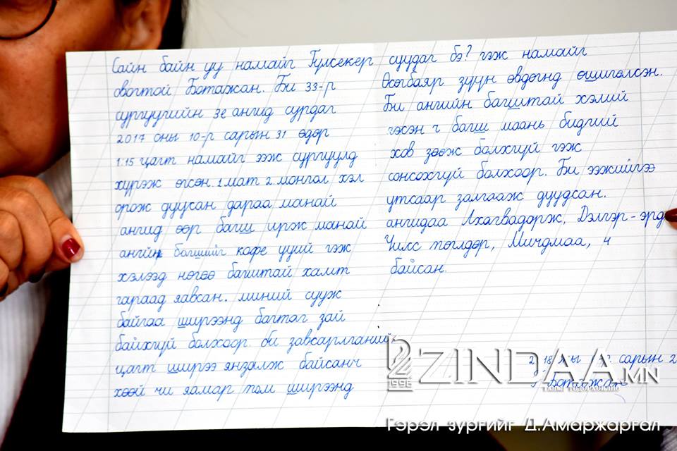 -Миний охин хамраас нь цус гардаггүй, ухаан алдаж унадаггүй, эрүүл саруул хүүхэд байсан. Охины шилбэ хэсгийн яс бага зэрэг товойлттой байсан учир биеийн тамирын хичээлд орж болохгүй гэдэг байсан. Үүнээс өөр өвчин эмгэг миний охинд байгаагүй. Охиныг гэмтээсэн хүүгийн аав, ээж шөнийн 22:00 цагт манай гэрт зөвшөөрөлгүй орж ирэн, намайг залилан хийж байна гэж гүжирдсэн. Энэ бүхэнд миний бие маш их гомдолтой байна.