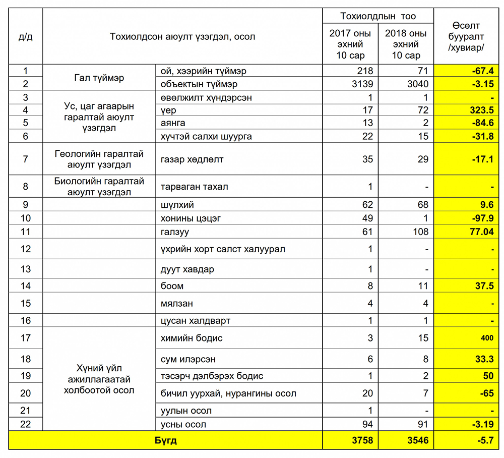 2018 оны эхний 10 сард тохиолдсон аюулт үзэгдэл, ослын тоог өнгөрсөн онтой харьцуулвал: