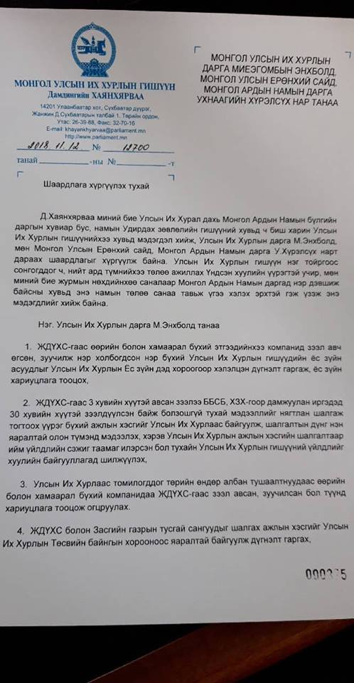 УИХ дахь МАН-ын бүлгийн дарга Д.Хаянхярваа хувь гишүүнийхээ зүгээс УИХ-ын дарга М.Энхболд, Ерөнхий сайд У.Хүрэлсүх нарт хандаж, албан шаардлага хүргүүлж байгаа мэдэгдлээ.