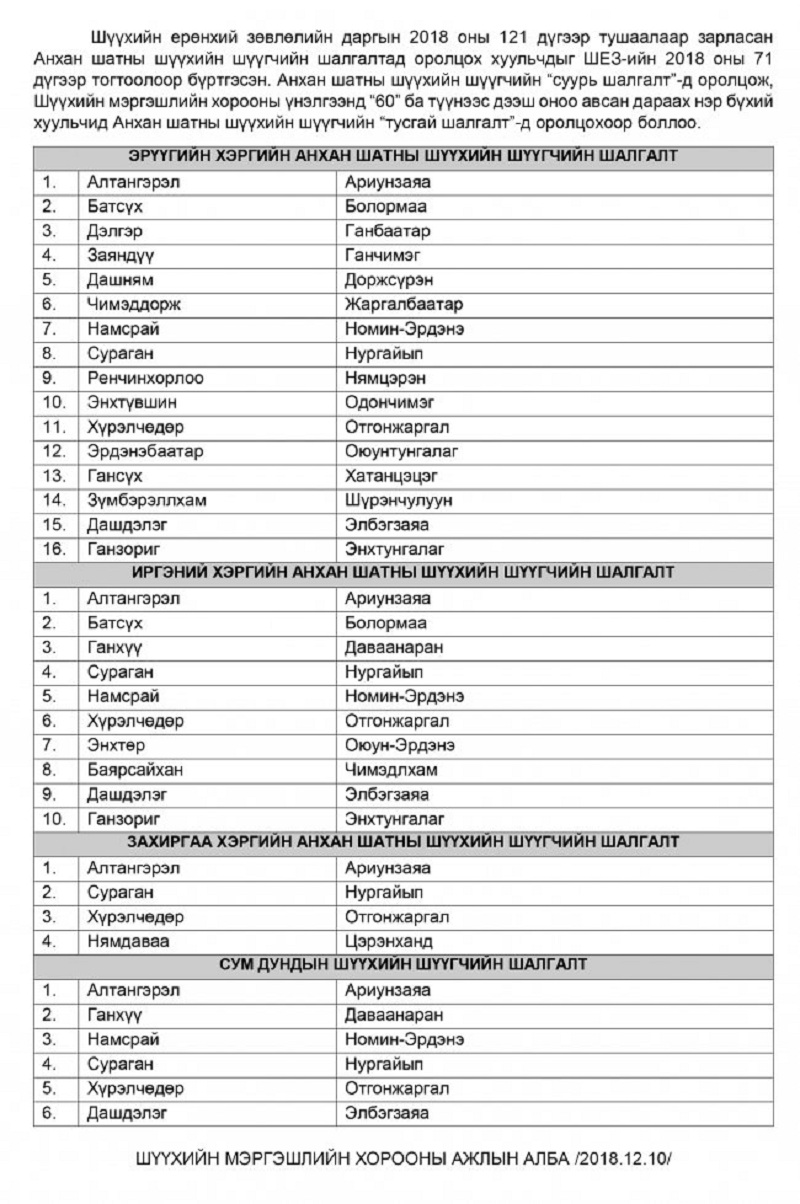 Шүүхийн ерөнхий зөвлөлийн даргын 2018 оны 121 дүгээр тушаалаар зарласан Анхан шатны шүүхийн шүүгчийн шалгалтад оролцох хуульчдыг ШЕЗ-ийн 2018 оны 71 дүгээр тогтоолоор бүртгэсэн. Анхан шатны шүүхийн шүүгчийн "суурь шалгалт”-д оролцож, Шүүхийн мэргэшлийн хорооны үнэлгээнд "60” ба түүнээс дээш оноо авсан дараах 36 хуульч Анхан шатны шүүхийн шүүгчийн "тусгай шалгалт”-д оролцохоор боллоо.