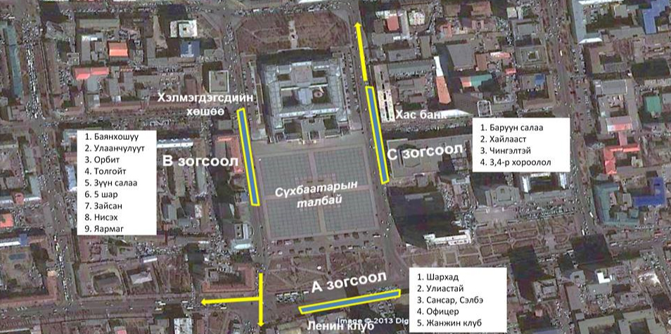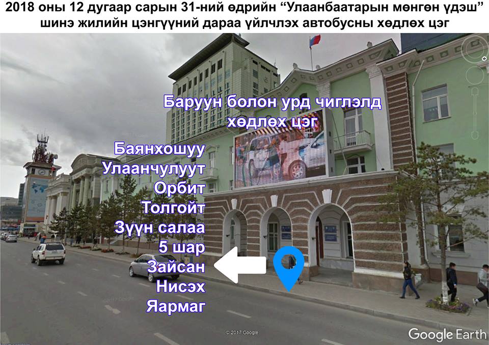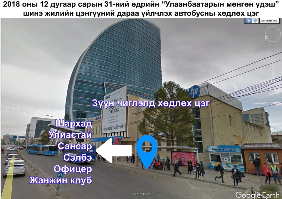 Үүнд: “Шинэ жилийн баярын цэнгүүн” нэгдсэн үйл ажиллагаа өндөрлөхөд их багтаамжийн автобусны 18 чиглэлд 18 автобус Сүхбаатарын талбайн баруун, зүүн болон урд зогсоол буюу зурагт тэмдэглэсэн “А”, “B”, “С” зогсоолоос суурьшлын цэгүүд рүү үнэ төлбөргүй үйлчлэхээр төлөвлөөд байна.