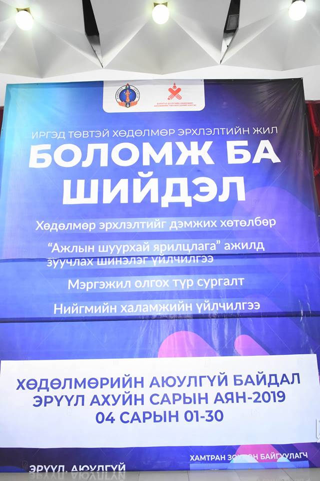 Тэрбээр 2019 оныг иргэд төвтэй хөдөлмөр эрхлэлтийн жилийн хүрээнд өнөөдрийн "Боломж ба шийдэл" өдөрлөгийг төрийн үйлчилгээг түргэн, шуурхай, чирэгдэлгүй үзүүлэх зорилгоор зохион байгуулж байгаа. Арга хэмжээний үеэр хөдөлмөр эрхлэлтийг дэмжих төсөл, хөтөлбөрт хамрагдсан үйлдвэрлэл, үйлчилгээ эрхлэгч нар өөрсдийн бараа бүтээгдэхүүний үзэсгэлэнг гаргасан.