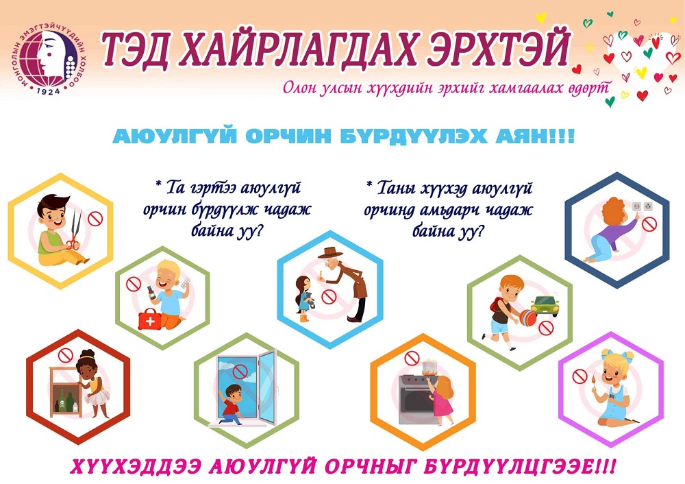 Гэртээ үзлэг хийгээрэй. Бид өөрсдөө мэдэхгүй зарим тохиолдолд хүүхдүүддээ аюултай орчин бүрдүүлсэн байдаг. Үүнтэй холбоотойгоор Монголын эмэгтэйчүүдийн холбооноос ирэх 7 хоногийг "Хүүхдэд ээлтэй, аюулгүй орчин бүрдүүлэх 7 хоног"-оор зарлалаа. Энэ хүрээнд ээж, аавууд та бүхэн гэр гэртээ үзлэг хийхийг уриалж байна. Таны хүүхдэд аюултай халуун тогоо, ус буцалгагч, элдэв эм бэлдмэл, ахуйн хэрэглээний бодисууд, хайч хутгаа зохих газарт байршдаг эсэхийг анзаарч нэг хараарай. Энэ нь хүүхэд хамгаалахад оруулж байгаа таны багагүй хувь нэмэр юм.