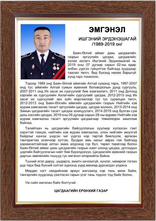 Төр, түмнийхээ өмнө өргөсөн тангарагтаа үнэнч байж, гэмт хэрэгтэй тэмцэх, олон нийтийн аюулгүй байдлыг хангах үүргээ гүйцэтгэж байгаад амь насаа алдсан талийгаачийн гэр бүл, төрөл төрөгсдөд нь цагдаагийн байгууллагаас гүн эмгэнэл илэрхийлээд байна.