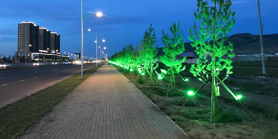 Эдгээрээс 4500 модыг өвөрмөц шийдэл бүхий ногоон лэд гэрлээр гэрэлтүүлж хотын өнгө төрх, ногоон шийдэл бүхий олны талархлыг хүлээсэн ажил болсон билээ. Энэ онд Яармагийн гүүрнээс Нисэхийн аюулгүй тойрог хүртэл замын хойд талаараа 1278 ширхэг, урд талаар 1080 ширхэг нарс модыг тарьсныг ногоон лэд гэрлээр гэрэлтүүллээ.