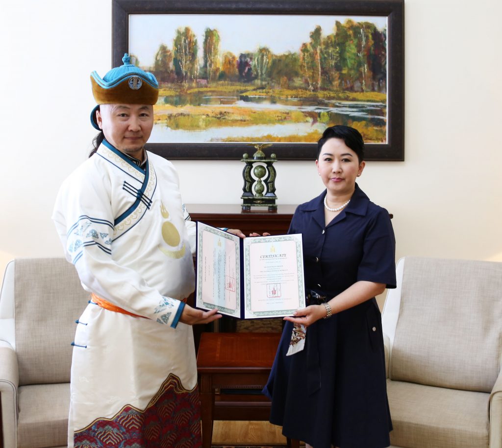 Гадаад харилцааны Дэд сайд Б.Батцэцэг өнөөдөр /2019.07.05/ туульч, хуурч, хөөмийч Эрдэнэцогтын Баатаржавт Монгол Улсын Соёлын элчийн гэрчилгээг гардуулан өглөө.