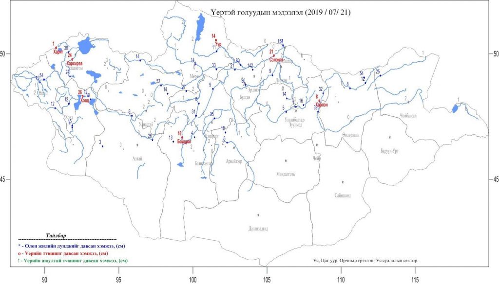 Түүнчлэн долдугаар сарын 23-ны өдрийн байдлаар Алтай нуруунаас эхтэй Ховд, Увс нуурын савын Хархираа, Хэнтий нурууны зүүн хажуугийн Хэрлэн, Хангай нурууны өврийн Байдраг болон Сэлэнгэ мөрөн Зүүн бүрэн сум орчимд үерийн түвшинг 5-20 см даван үерлэж буй юм байна.
