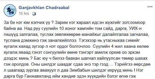 Энэ талаар Ч.Ганжавхлан өөрийн фэйсбүүк хуудсандаа дараах зүйлийг бичжээ.
