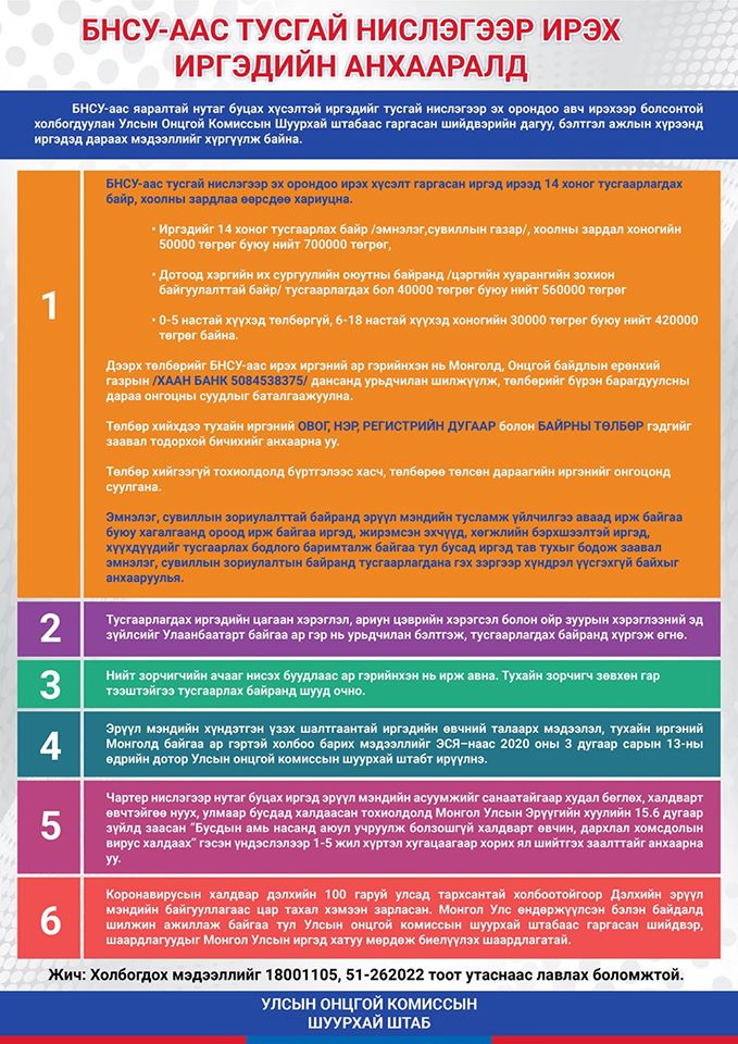 Олон улсын нислэгүүдийг түр зогсоосонтой холбоотойгоор эх орондоо буцах боломжгүй болоод байгаа гадаадын иргэдийг тухайн улсын Дипломат төлөөлөгчдийн газруудын албан ёсны хүсэлтийн дагуу дээрх нислэгүүдээр нэн түрүүнд тээвэрлэх бөгөөд гадаад улсад эмчилгээнд явах шаардлагатай, гадаад улсад оршин суудаг, суралцдаг Монгол Улсын иргэдийг мөн Улаанбаатараас тээвэрлэх юм. Цаашид гадаад улсад зорчиж яваад нутаг буцах боломжгүй болсон монгол иргэдийн өргөдөл, хүсэлтийг харгалзан шаардлагатай тохиолдолд нэмэлт нислэг зохион байгуулах асуудлыг Улсын онцгой комисст танилцуулан шийдвэрлэх чиглэлээр ажиллах тул ард иргэдийг хүлээцтэй, тайван байж, ойр байрлах Монгол Улсын Элчин сайдын яам болон Консулын газруудад хандах, эсвэл Гадаад харилцааны яамны шуурхай утас /83042222, 83052222/-аар холбогдохыг зөвлөж байна.