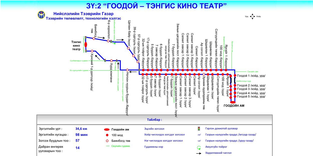- ЗҮ:2 “Гоодой-Тэнгис кино театр” чиглэлд 1 их багтаамжийн автобус 1 цаг тутамд "Тэнгис" кино театрын зогсоолоос,