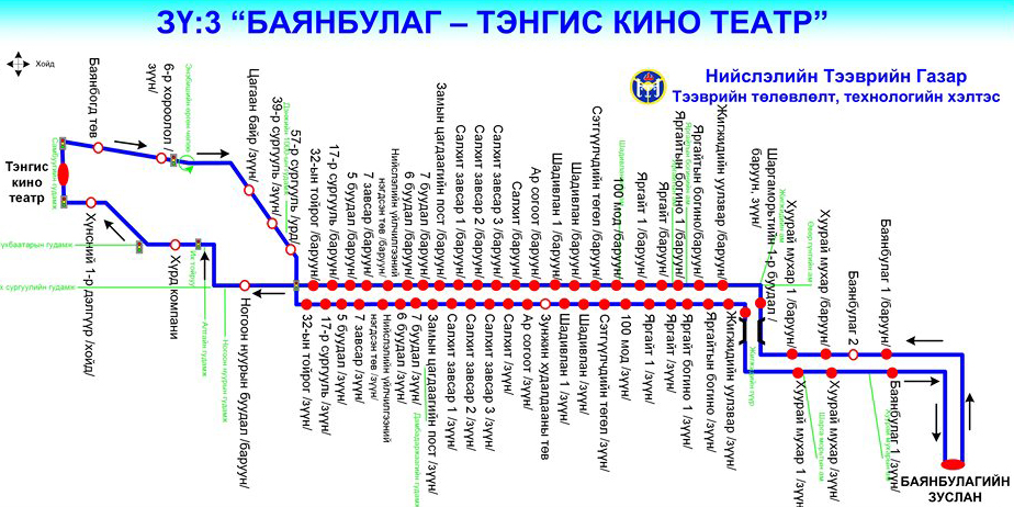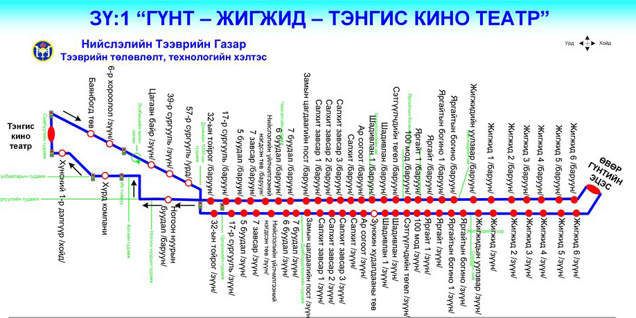 - ЗҮ:1 “Гүнт-Жигжид-Тэнгис кино театр” чиглэлд их багтаамжийн 3 автобус 35 минут тутамд "Тэнгис" кино театрын зогсоолоос,