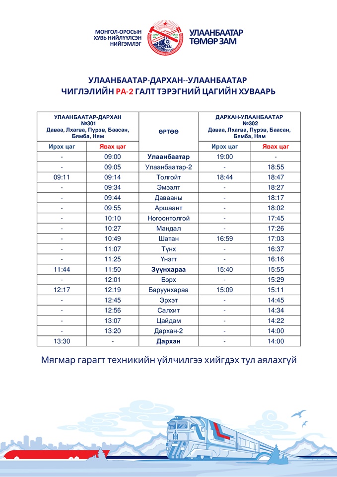 Төмөр замын автобус РЭЙЛБУС 2020 оны 6 сарын 12-ны өдрөөс эхлэн МЯГМАР гарагаас бусад өдөр Улаанбаатар-Дархан-Улаанбаатар чиглэлд аялахаар болжээ.