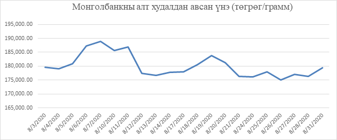 2020 оны наймдугаар сард Монголбанкны алт худалдан авсан үнэ (төгрөг/грамм)